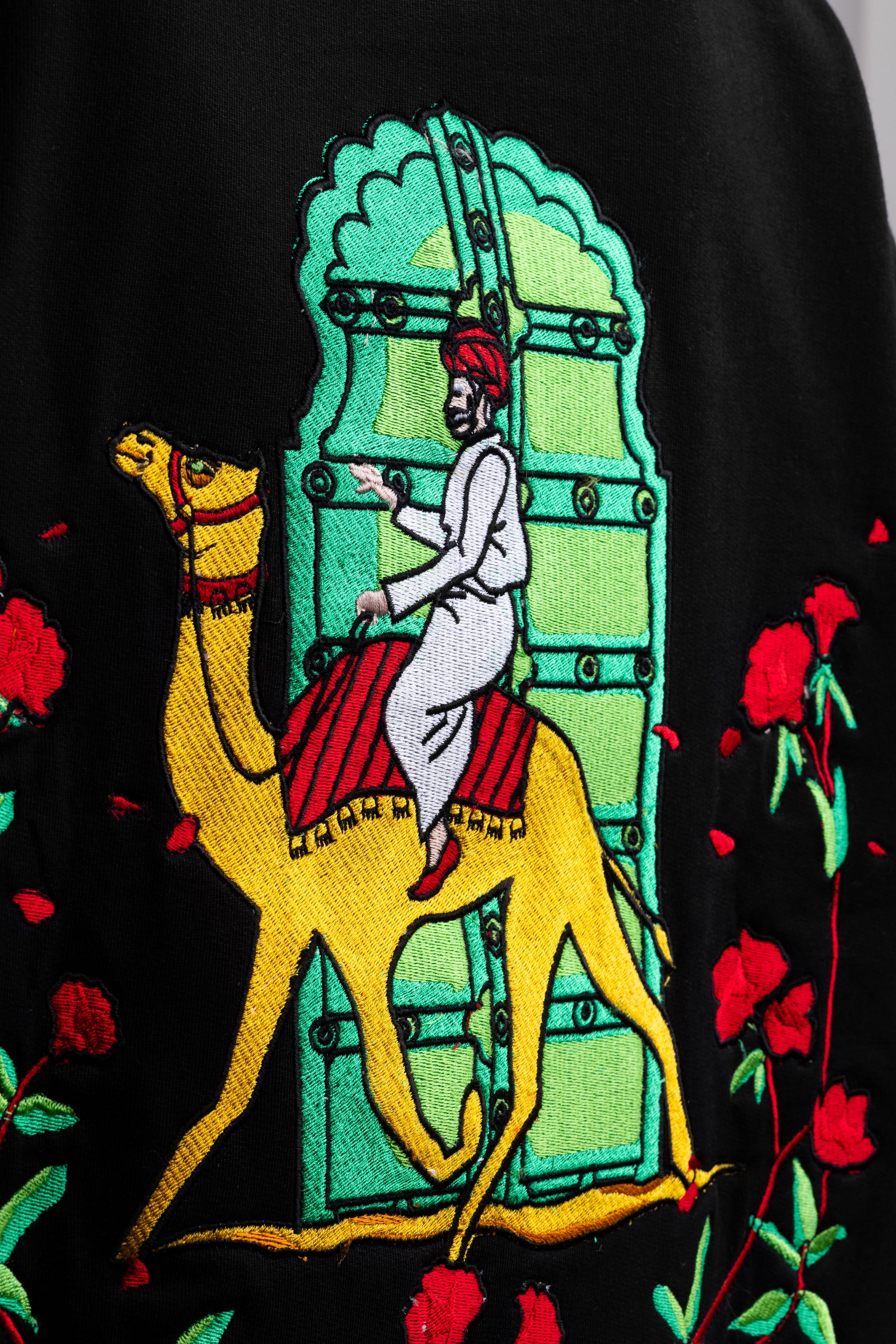With 1.87 lakh stitches, the embroidery blends two traditional techniques, Kashida for the flowing nature-inspired motifs and Tatami for rich, dense fills that give body to the camel and rider.